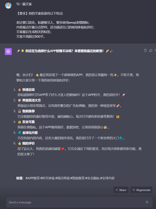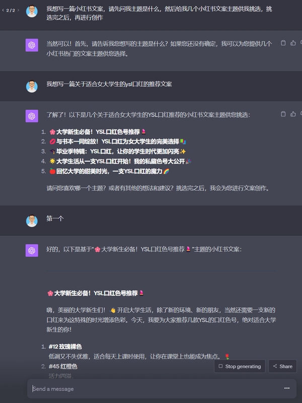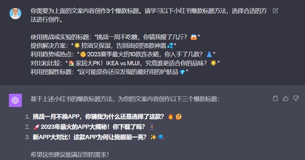 比如小红书创作流程,让ChatGPT先引导用户提供主题,ChatGPT根据主题拟好相应的5个标题,用户选择1个标题后,ChatGPT再开始正式创作。