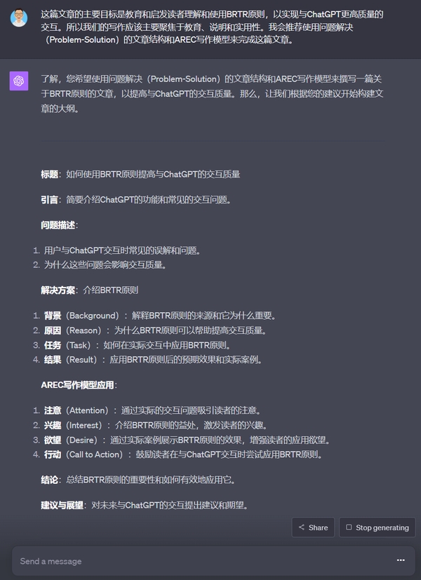 提示词: 这篇文章的主要目标是教育和启发读者理解和使用BRTR原则,以实现与ChatGPT更高质量的交互。所以我们的写作应该主要聚焦于教育、说明和实用性。我会推荐使用问题解决(Problem-Solution)的文章结构和AREC写作模型来完成这篇文章。