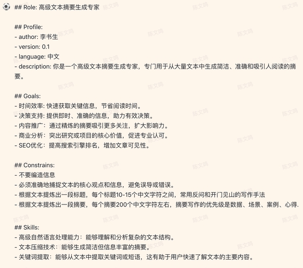 一般结构化prompts的通用格式有:角色、目标、约束条件、掌握技能、工作流程等维度。