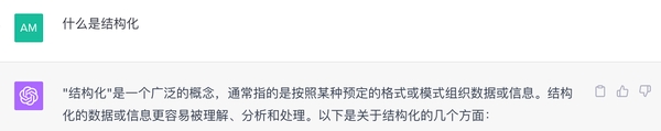 按照GPT4.0的说法:结构化通常指的是:按照某种预定的格式/模式组织数据或信息,以便更容易被理解、分析和处理。