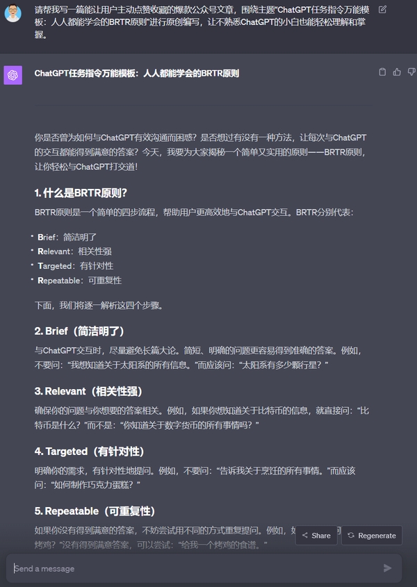 任务:请帮我写一篇能让用户主动点赞收藏的爆款公众号文章,围绕主题“ChatGPT任务指令万能模板:人人都能学会的BRTR原则”进行原创编写,让不熟悉ChatGPT的小白也能轻松理解和掌握。