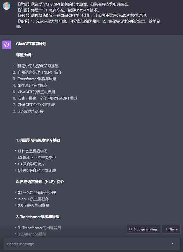 举个例子,运用“BRTR”原则让ChatGPT帮我制定“ChatGPT学习计划”,可以看到他针对我没有“技术知识基础”的背景,特意加上了“计算机科学基础”这一章节,内容输出的结构,也遵循了“先列出大纲后讲解章节”的要求。
